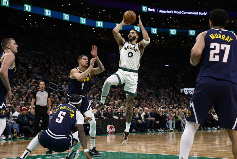 波士顿凯尔特人队的杰森吉祥坊APP·塔图姆在波士顿 TD 花园对阵丹佛掘金队的比赛中得分。